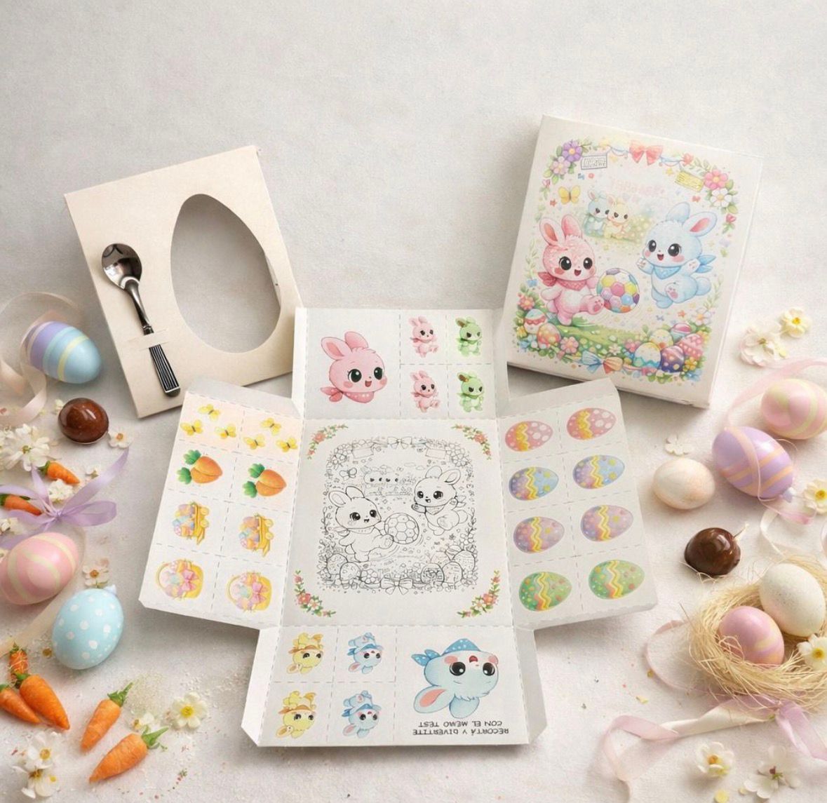 🐣 Al abrirla, los laterales se despliegan mostrando el huevo de Pascua y diferentes actividades para que los chicos sigan jugando.
