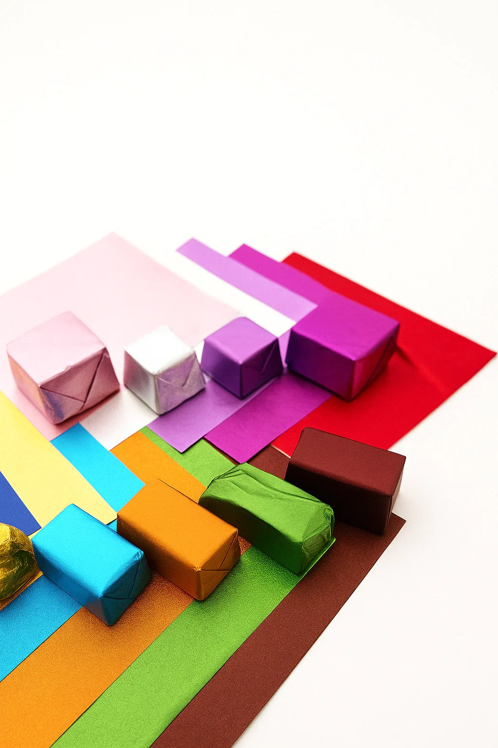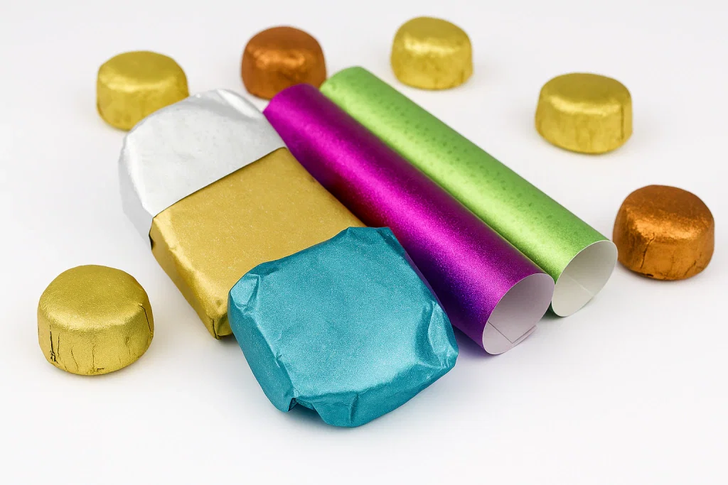 Papel aluminio en resma de colores Ideal para bombones, huevitos de pascuas y alfajores.