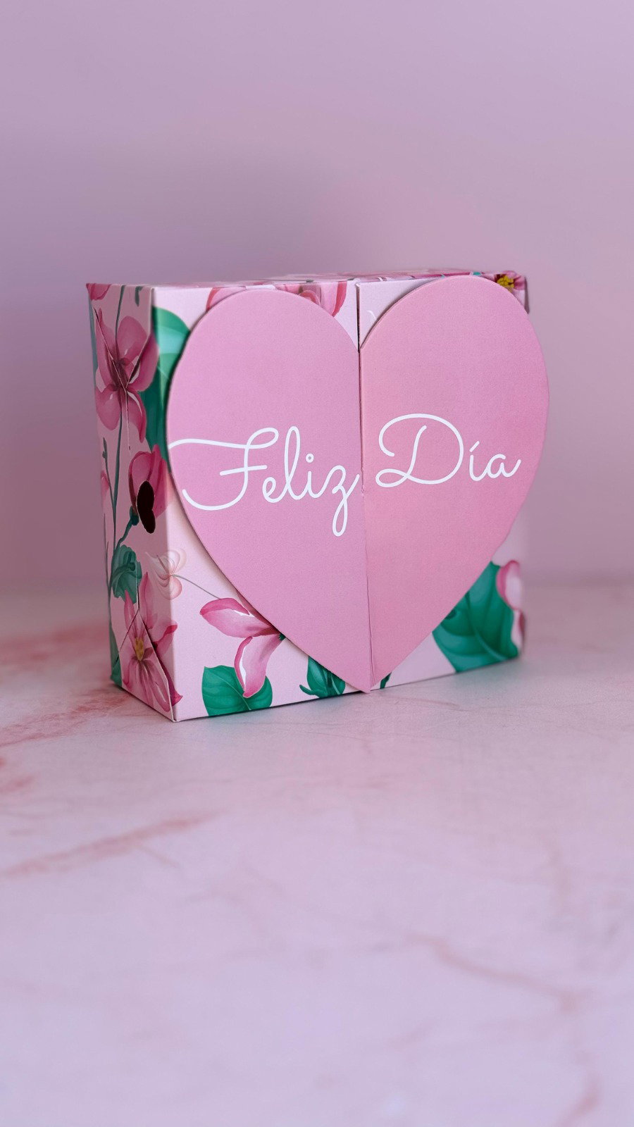Esta caja especial está diseñada con un delicado estampado floral en tonos pasteles y la frase “Feliz Día”, transmitiendo ternura y elegancia en cada detalle.